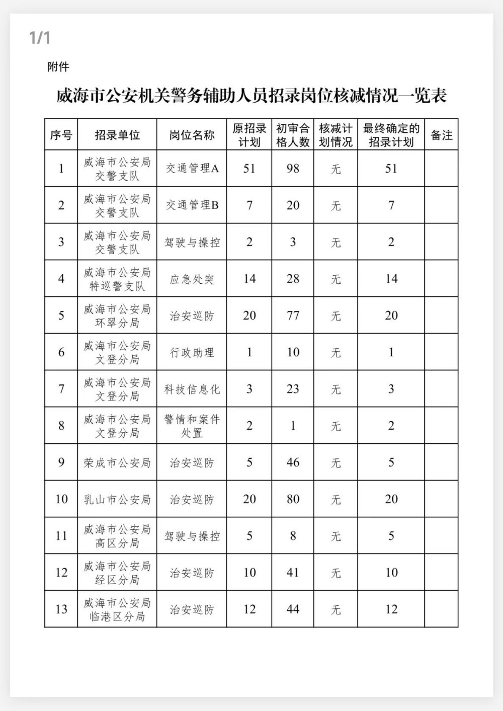 附件:威海市公安機關警務輔助人員招錄崗位核減情況一覽表