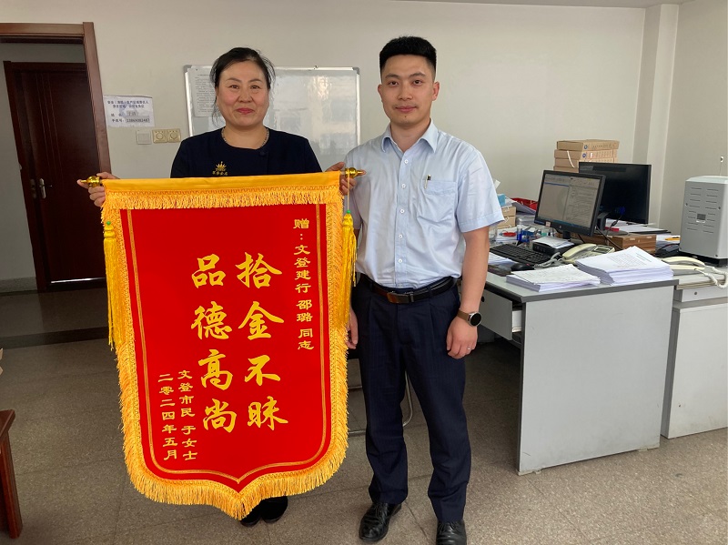 5月14日下午,于女士帶著一面錦旗來到建設(shè)銀行威海文登支行,詢問邵璐是否在這里工作,要當面感謝邵璐經(jīng)理。經(jīng)過于女士的講述,原來她的手機于上5月12日晚聚餐結(jié)束后丟失在路邊,而自己并未發(fā)覺。邵璐撿到手機后,在鎖屏照片里發(fā)現(xiàn)于女士工作的店名,繼而搜索到該店的抖音號,通過老板聯(lián)系到于女士家屬,于女士這才得知自己手機丟失。
